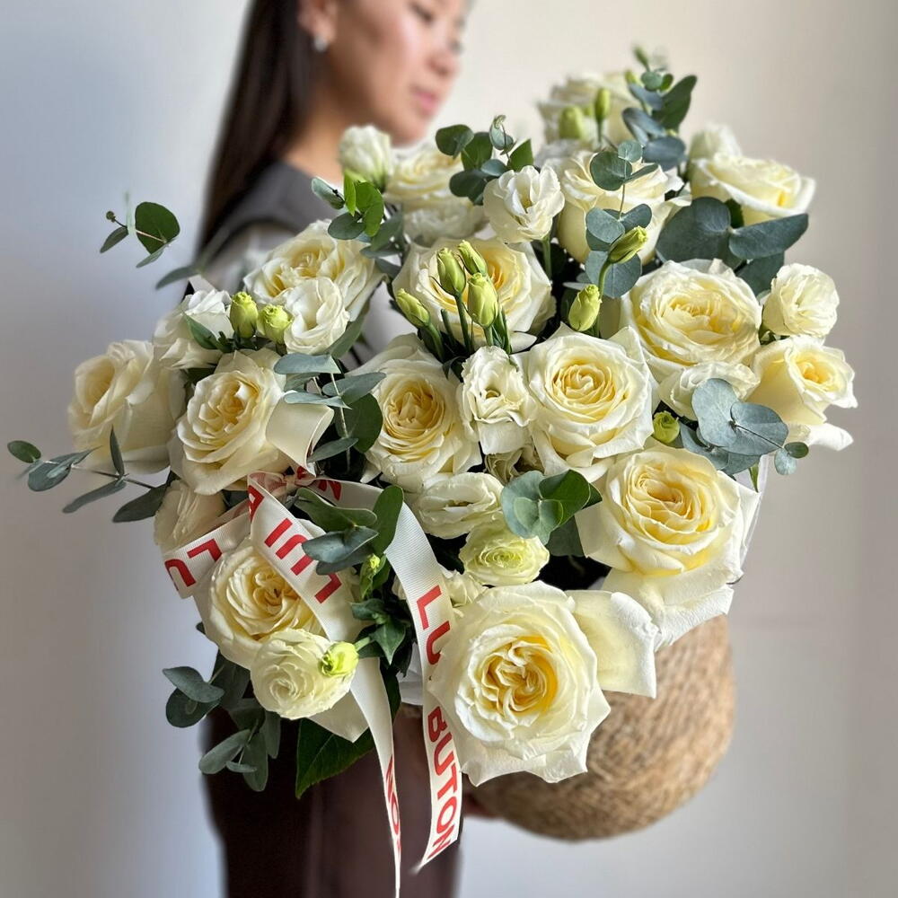 Композиция из эустом, пионовидных роз и эвкалипта в кашпо - для тех, кто ценит изысканность, аромат и гармонию оттенков