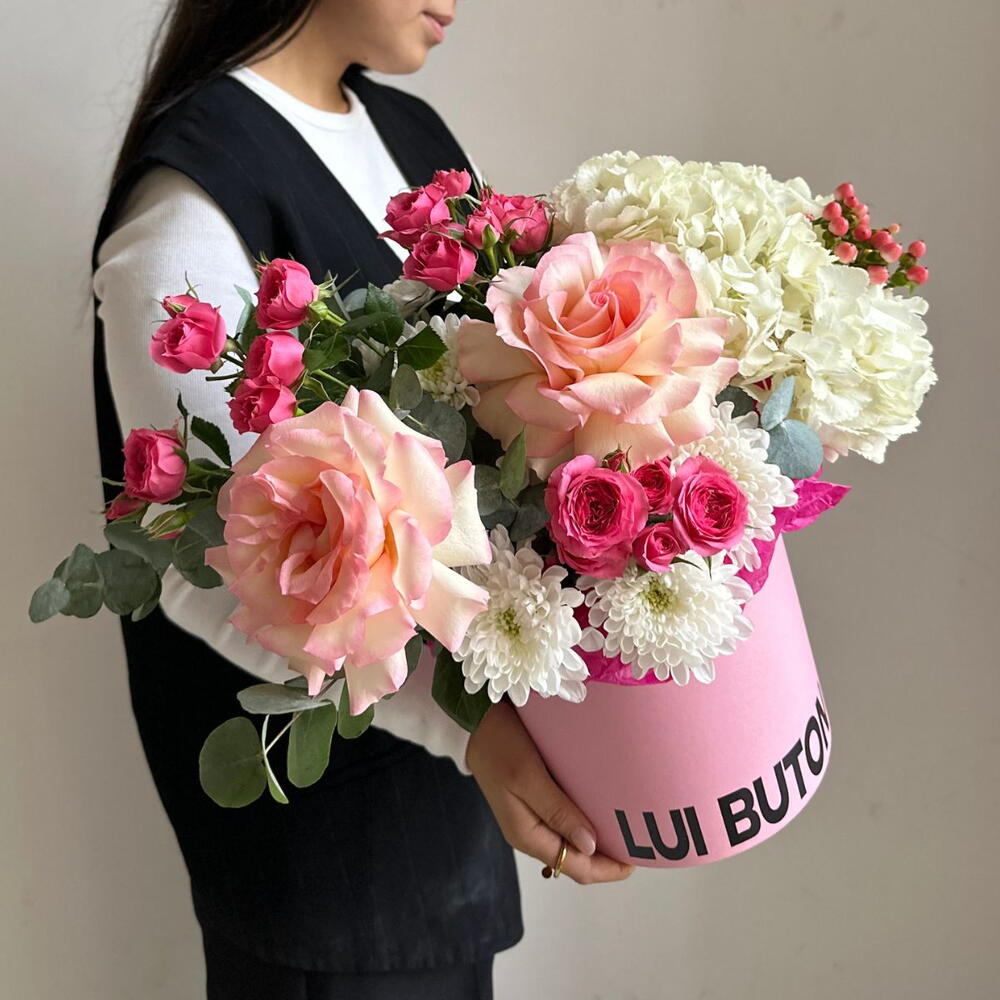 Гиперикум - 1 шт. Гортензия - 1 шт. Эвкалипт - 1 шт. Хризантема - 2 шт. розы - 2 шт. кустовые розы - 3 шт.