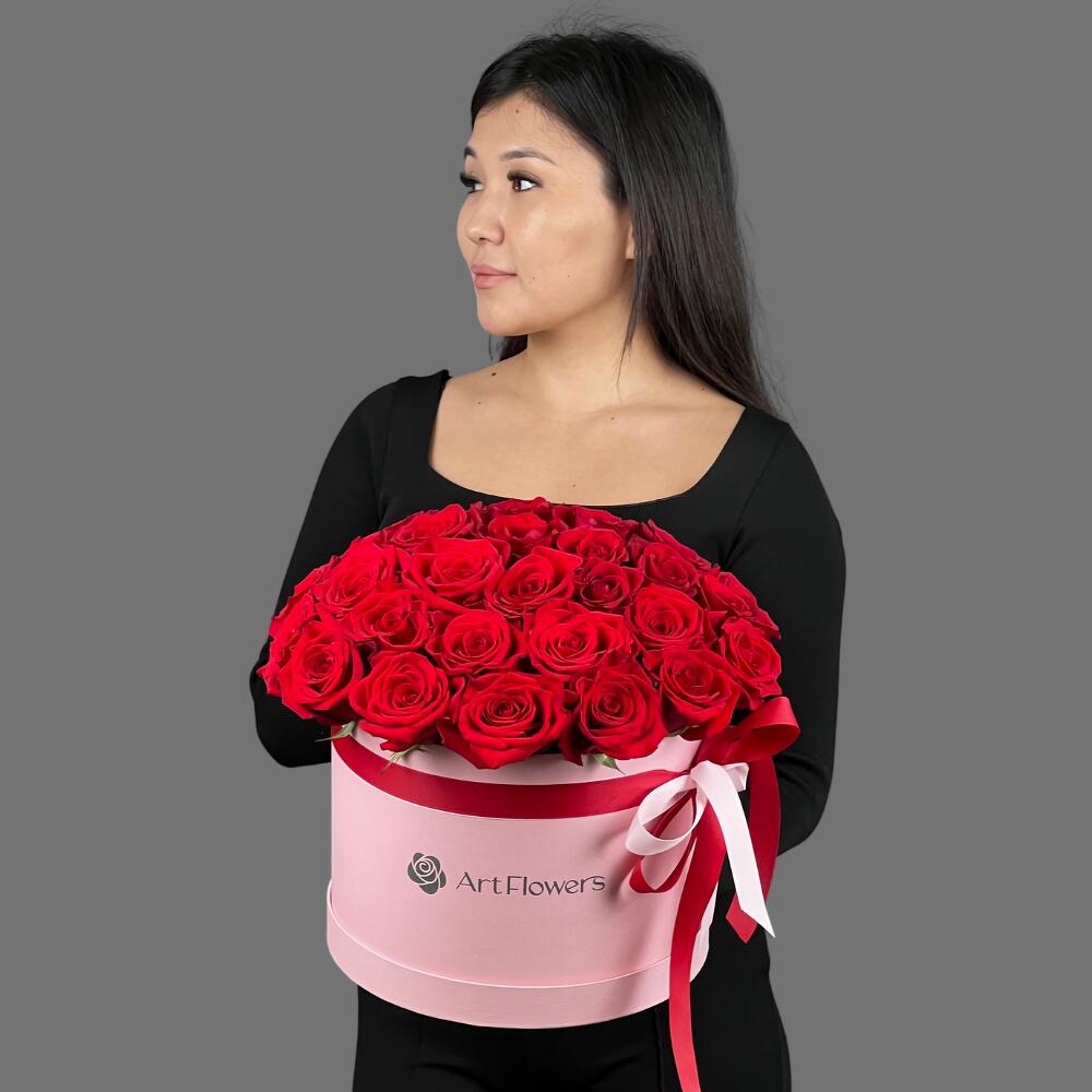 35 бархатных красных роз в изысканной коробке — символ страсти, преданности и традиционных чувств. Эффектный подарок для особого случая