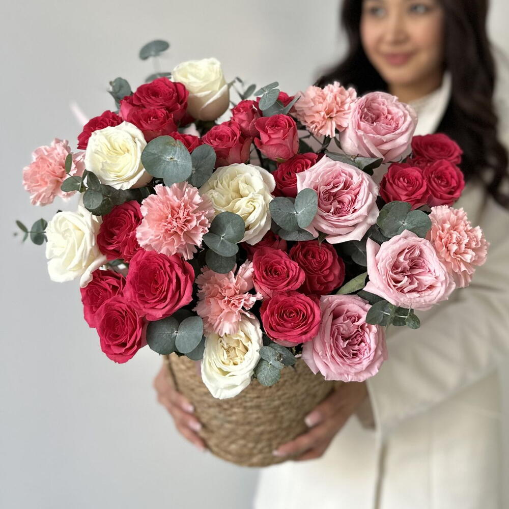 Эвкалипт - 2 шт. Роза - 5 шт. Диантус - 5 шт. пионовидные розы - 4 шт. кустовые розы - 5 шт.
