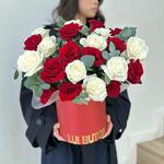 Данная композиция из роз микс с эвкалиптом умеет делать волшебство: стоит лишь взглянуть — и настроение сразу становится светлее и спокойнее