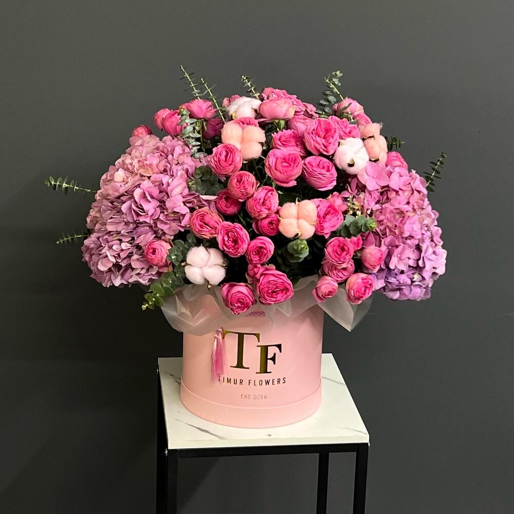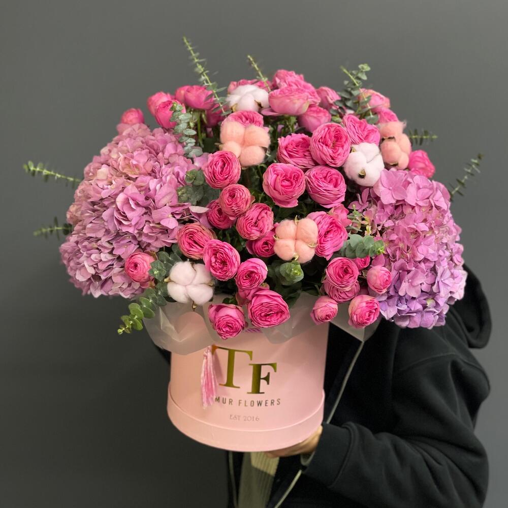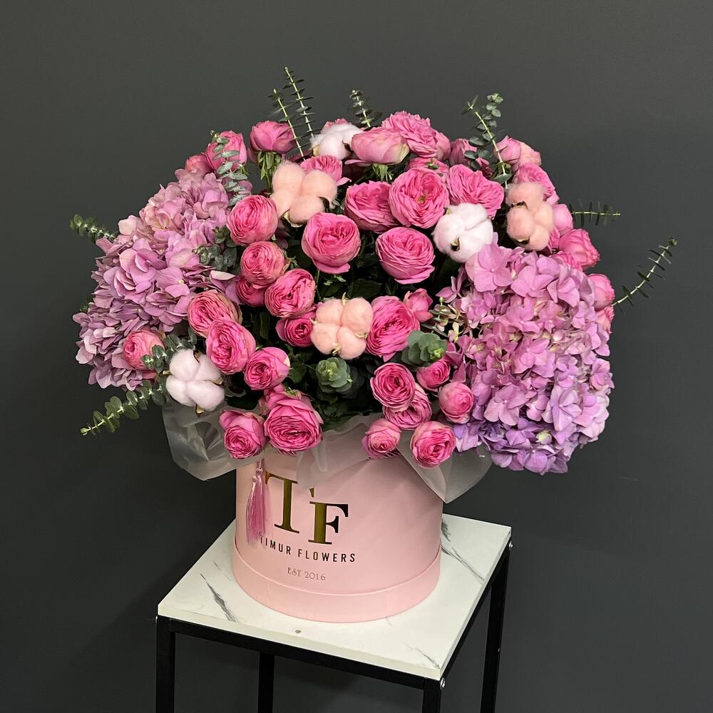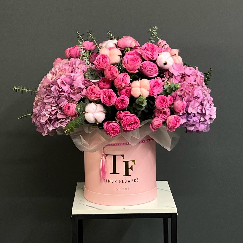 Композиция с Королевскими Гортензиями и пионовидной спрей розой