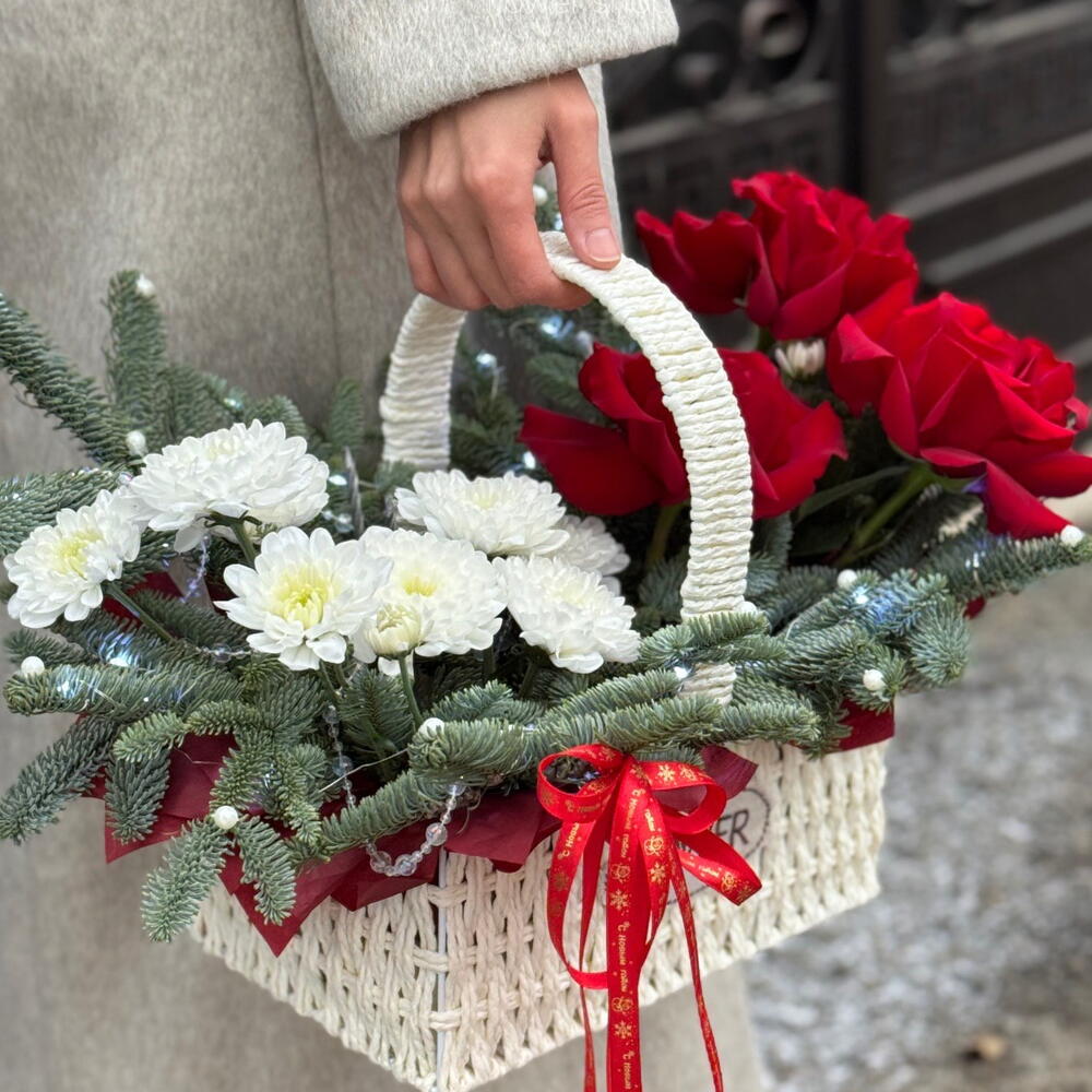 Корзина - 1 шт. Хризантема кустовая - 1 шт. Нобилис - 1 шт. гирлянда новогодняя - 1 шт. розы - 3 шт.