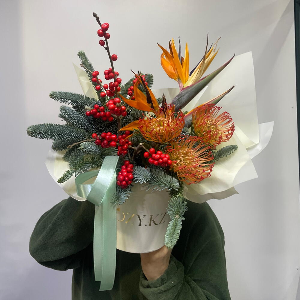 Илекс - 2 шт. Стрелиция - 2 шт. Нутан - 3 шт. Коробка - 1 шт. Нобилис - 2 шт. Оазис флористический - 1 шт.