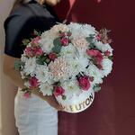 Эта утонченная композиция превратит любой день в особенный момент. Элегантная коробка скрывает в себе настоящий сад: ароматный эвкалипт, трех ярких диантуса, трёх пышных хризантем и трёх кустовых роз. Сочетание разных оттенков и текстур делает этот букет стильным и модным аксессуаром. Удивите своих близких изысканным подарком, который придаст любому интерьеру особую прелесть и шарм.
