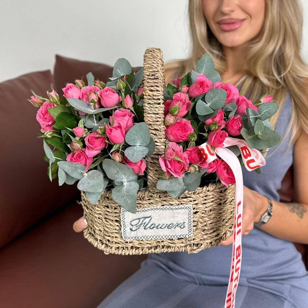 Композиция из кустовых роз с эвкалиптом в корзине сохраняет цветы в идеальном виде и выглядит по-настоящему празднично. Она всегда вызывает восторг