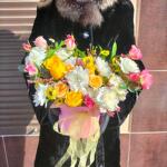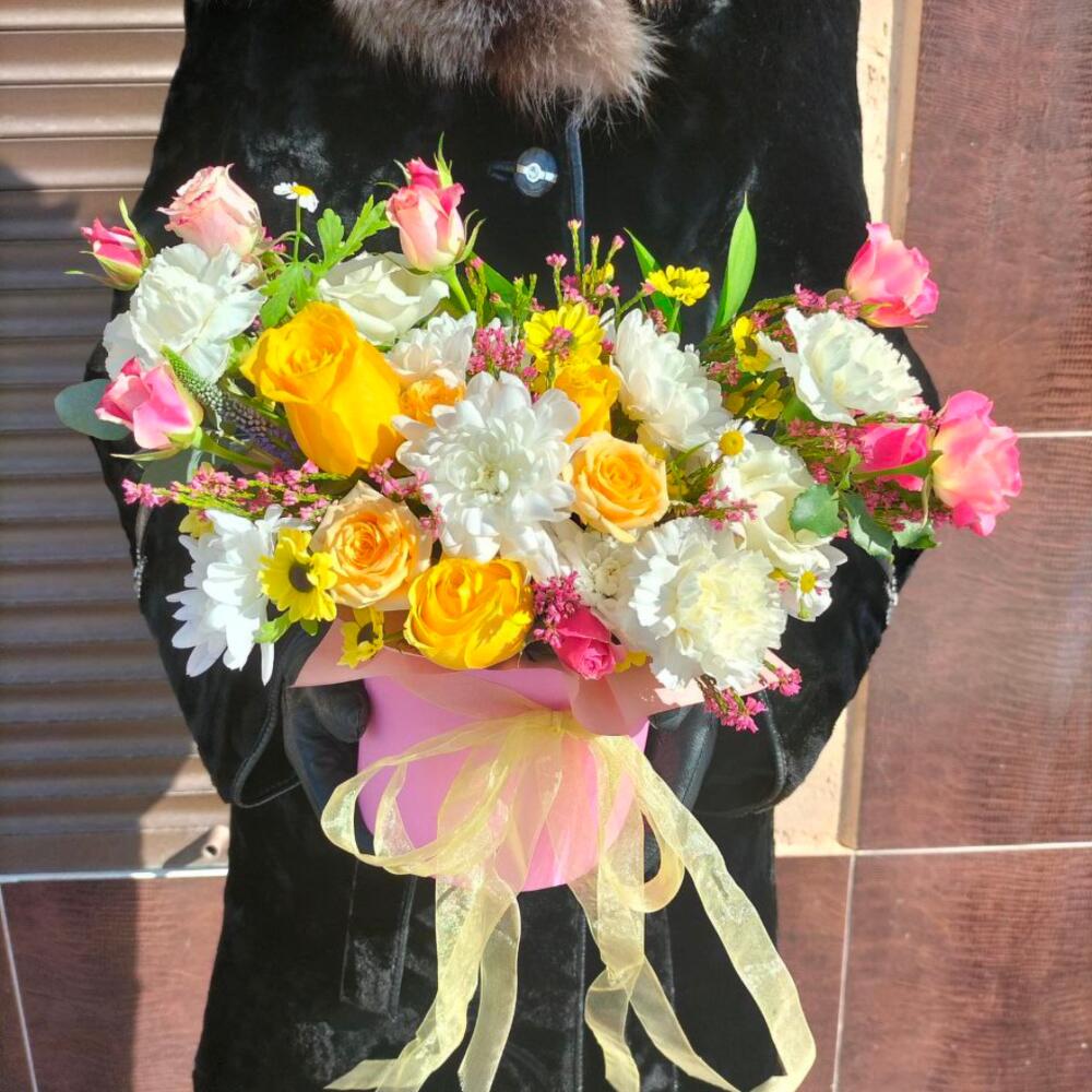 Хризантема кустовая - 1 шт. Гвоздика - 3 шт. Сантини - 2 шт. Спрей роза - 3 шт. декоративная зелень - 3 шт. микс роза - 3 шт.