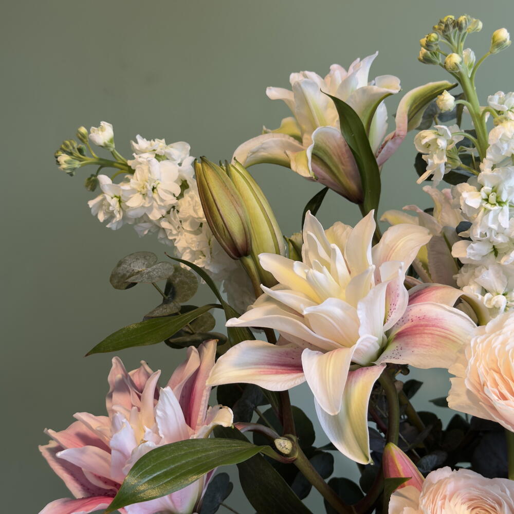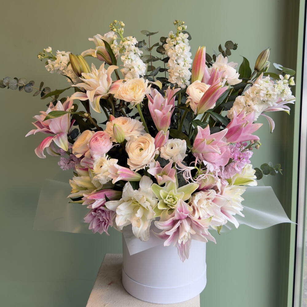 Лилия - 6 шт. Маттиола - 5 шт. Эвкалипт - 6 шт. Ранункулюс - 9 шт. нерине - 3 шт.