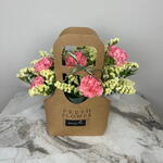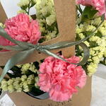 Лента атласная - 1 шт. Диантус - 5 шт. Оазис флористический - 1 шт. статица ветка - 4 шт. бумага пленка - 1 шт. сумочка крафт картон - 1 шт.