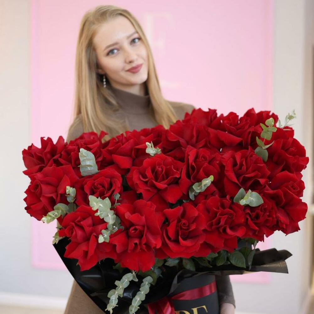 Эвкалипт - 3 шт. Черная коробка - 1 шт. французские розы - 21 шт.