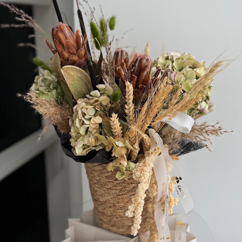 Амариллис - 1 шт. Пшеница - 20 шт. Лагурус - 10 шт. камыш декоративный - 3 шт. гортензия сухоцвет - 3 шт. протея сухоцвет - 3 шт. пампас сухоцвет - 5 шт.