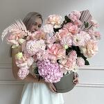 Гортензия - 1 шт. Лизиантус - 7 шт. Роза - 9 шт. Коробка - 1 шт. пальма сухоцвет - 1 шт.