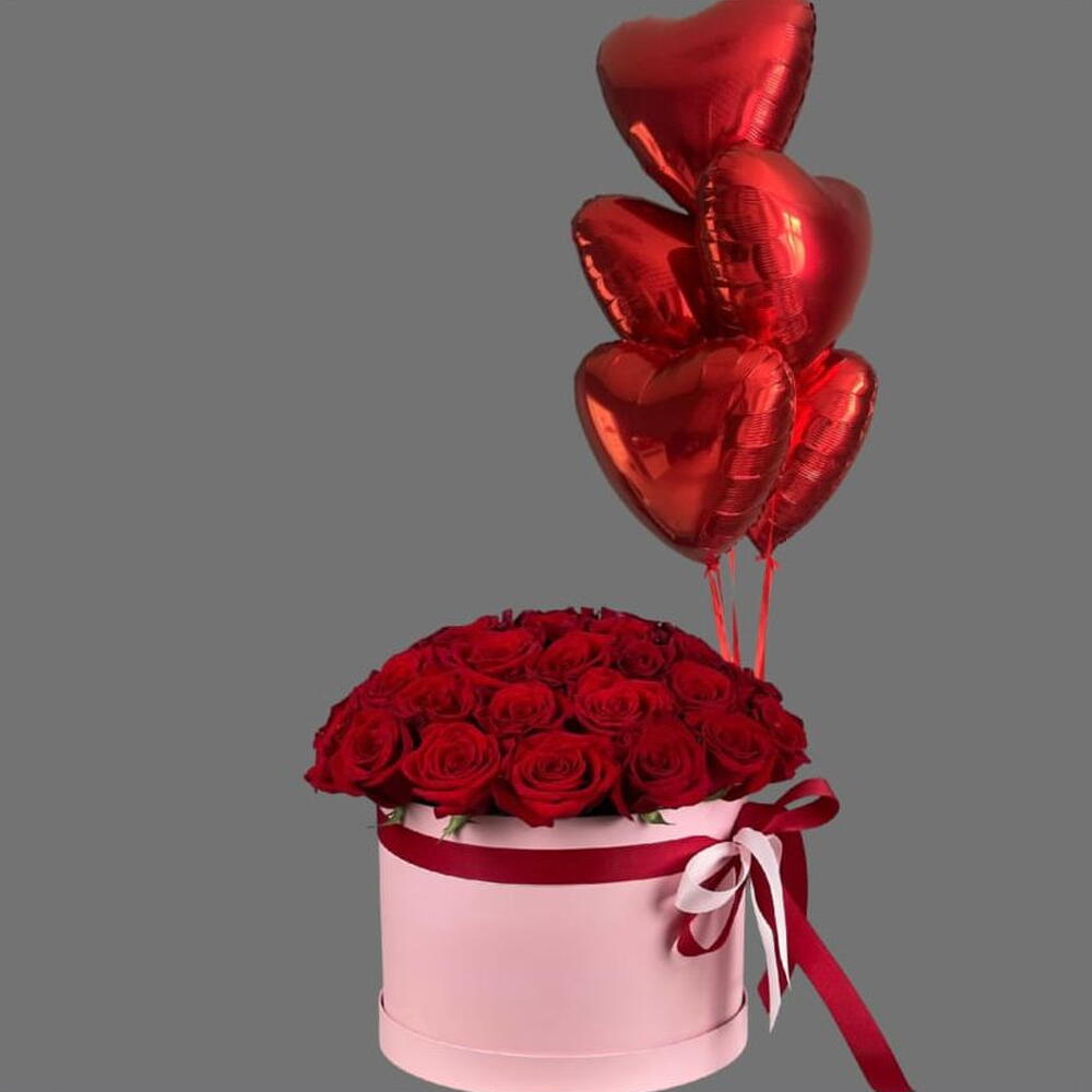 Цветочная композиция в коробке из красных роз с пятью шарами в форме сердца. Готовый романтический подарок без лишних дополнений.