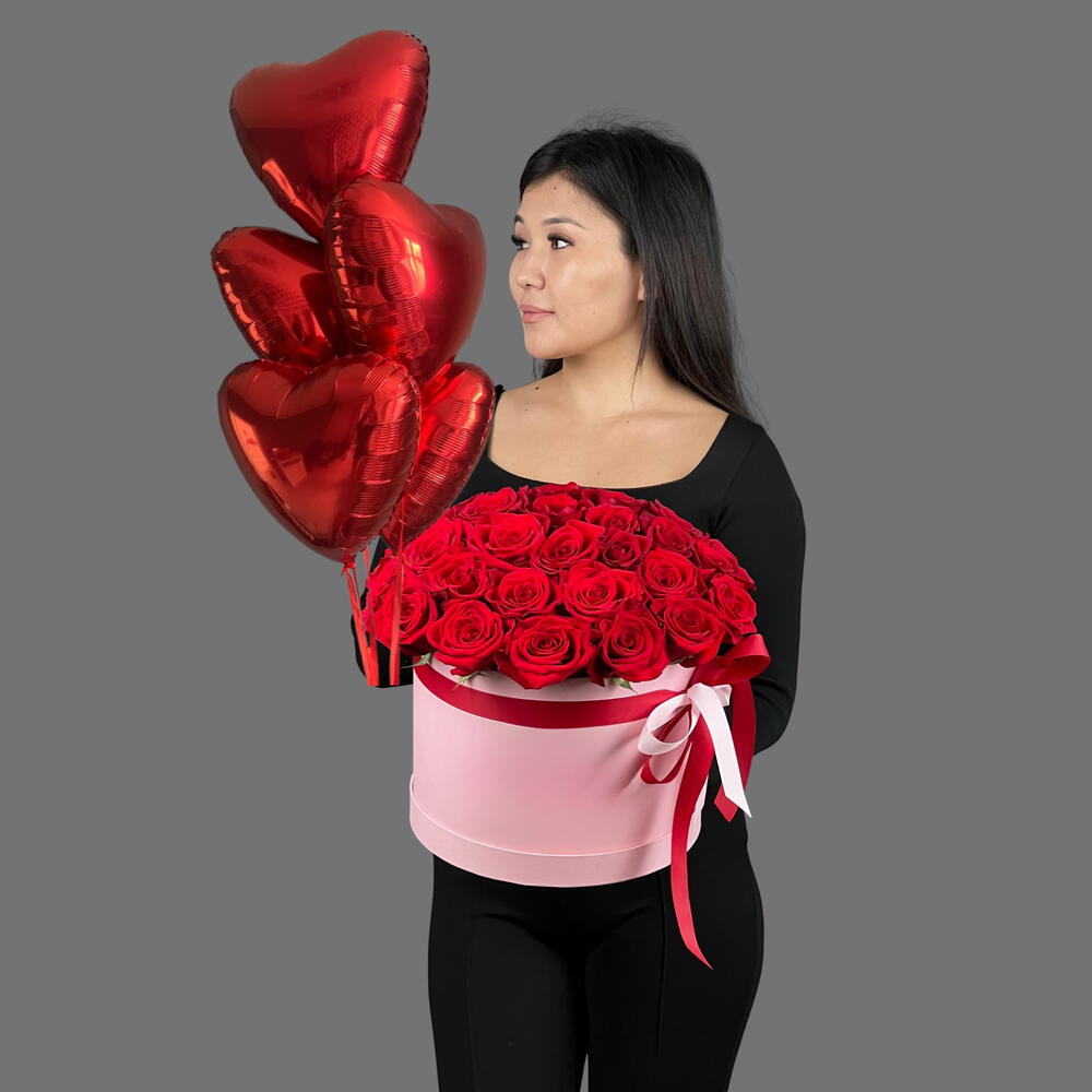 Цветочная композиция в коробке из красных роз с пятью шарами в форме сердца. Готовый романтический подарок без лишних дополнений.