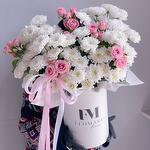Композиция в коробке из хризантемы и кустовых роз