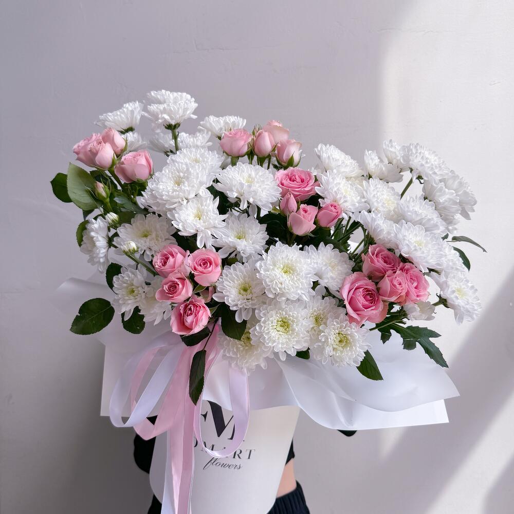 Композиция в коробке из хризантемы и кустовых роз