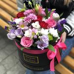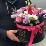 Роза розовая - 3 шт. Роза белая - 2 шт. Роза кустовая красная - 2 шт. эустома фиолетовая - 3 шт. Коробка подарочная с крышкой - 1 шт. Хризантема Кустовая Бакарди белая - 3 шт. Хризантема розовая бакарди - 2 шт. зелень декоративная - 5 шт.