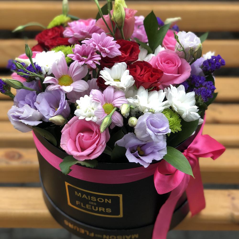 Роза розовая - 3 шт. Роза белая - 2 шт. Роза кустовая красная - 2 шт. эустома фиолетовая - 3 шт. Коробка подарочная с крышкой - 1 шт. Хризантема Кустовая Бакарди белая - 3 шт. Хризантема розовая бакарди - 2 шт. зелень декоративная - 5 шт.