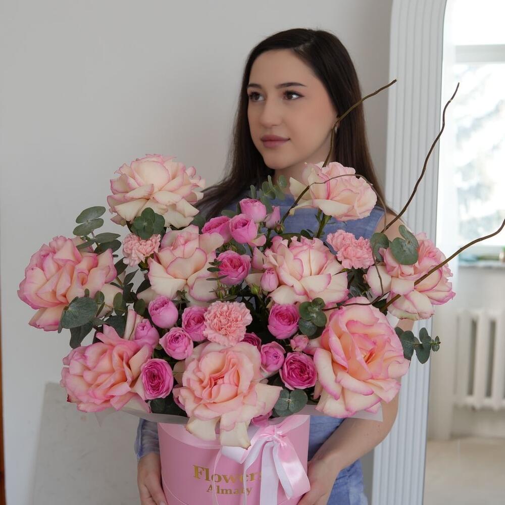 Лизиантус - 3 шт. Эвкалипт - 3 шт. Коробка - 1 шт. декоративные ветки - 3 шт. французские розы - 9 шт. спрей розы - 3 шт.