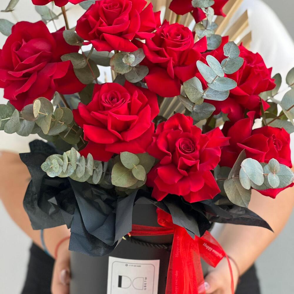 Эвкалипт - 3 шт. Сухоцвет - 1 шт. розы - 9 шт.