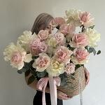 Эвкалипт - 1 шт. Эустома - 5 шт. Кашпо - 1 шт. Французская роза - 15 шт.