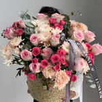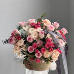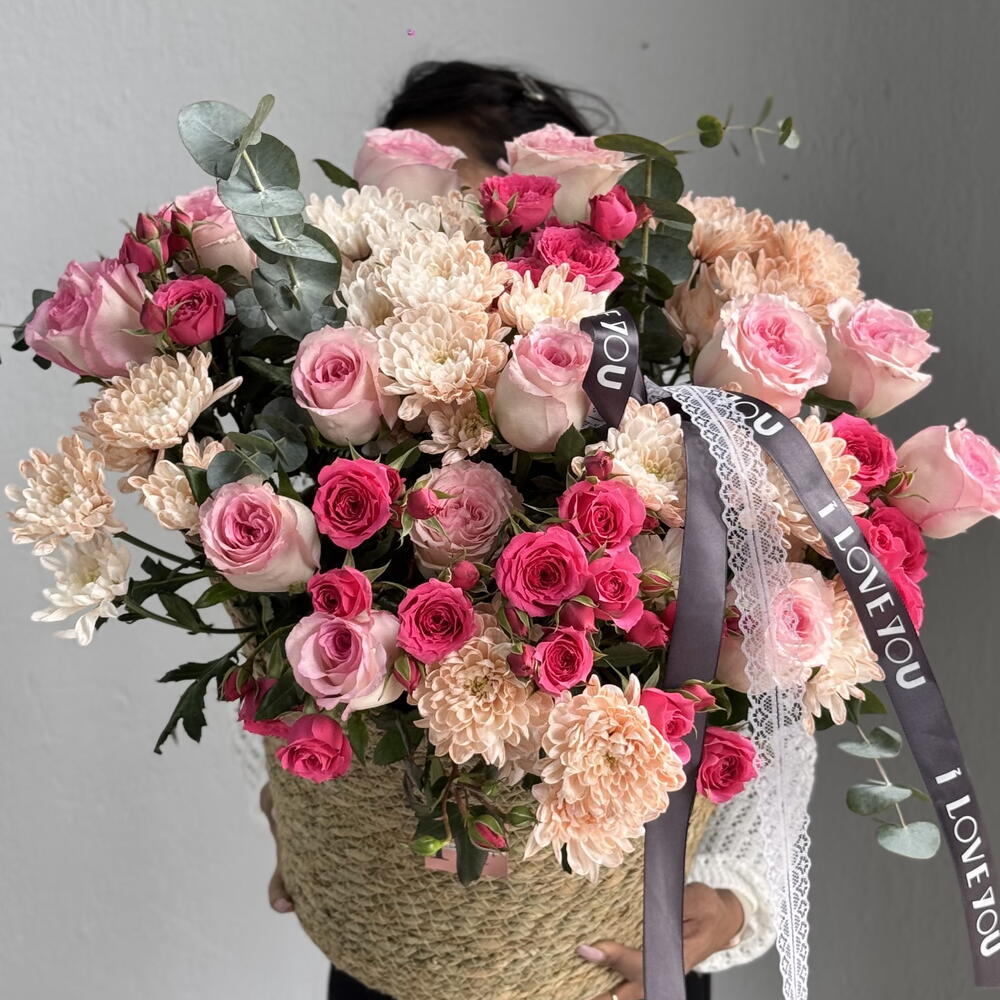 Эвкалипт - 6 шт. Хризантема розовая - 5 шт. Корзина плетенная - 1 шт. спрей роза софи - 6 шт. розы монада - 13 шт.