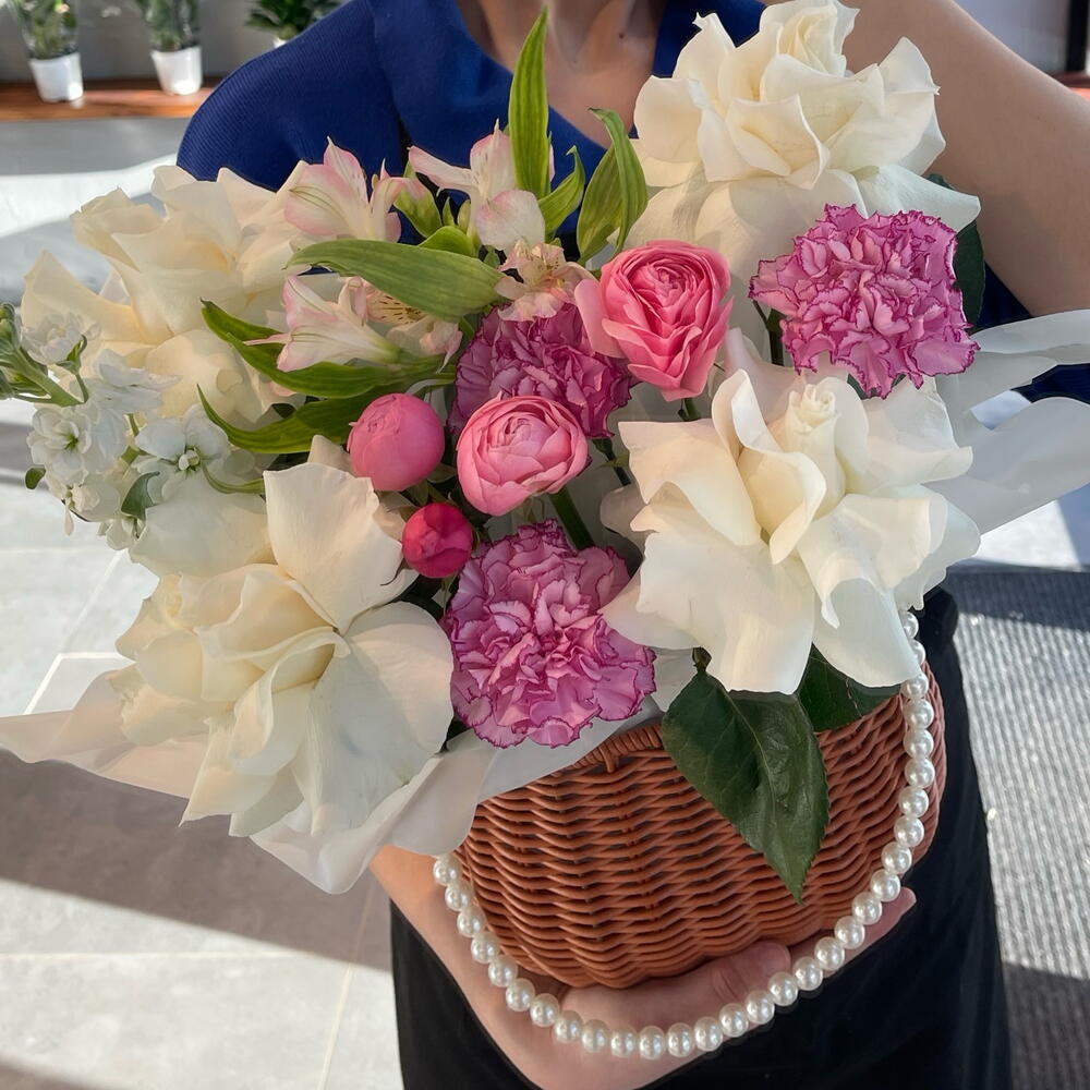 Альстромерия - 1 шт. Маттиола - 1 шт. Роза - 4 шт. Кустовая роза - 1 шт. Гвоздика - 3 шт.
