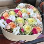 Ваксфлауэр - 1 шт. Роза кремовая - 5 шт. Роза кустовая кремовая - 1 шт. Роза белая - 5 шт. Роза кустовая розовая - 1 шт. Сердце - 1 шт. эустома белая - 3 шт.