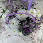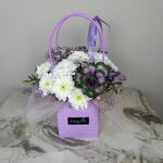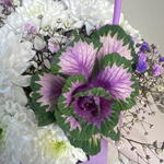 Хризантема кустовая - 1 шт. Лента атласная - 1 шт. Брассика - 1 шт. Оазис флористический - 1 шт. зелень фисташки ветка - 1 шт. бумага пленка - 1 шт. сумочка s картон - 1 шт. гипсафила ветка - 2 шт.