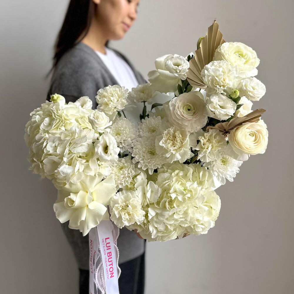 Воздушная цветочная композиция в мягких белых тонах выглядит элегантно и современно. Идеальный выбор для романтического жеста или искреннего подарка