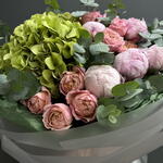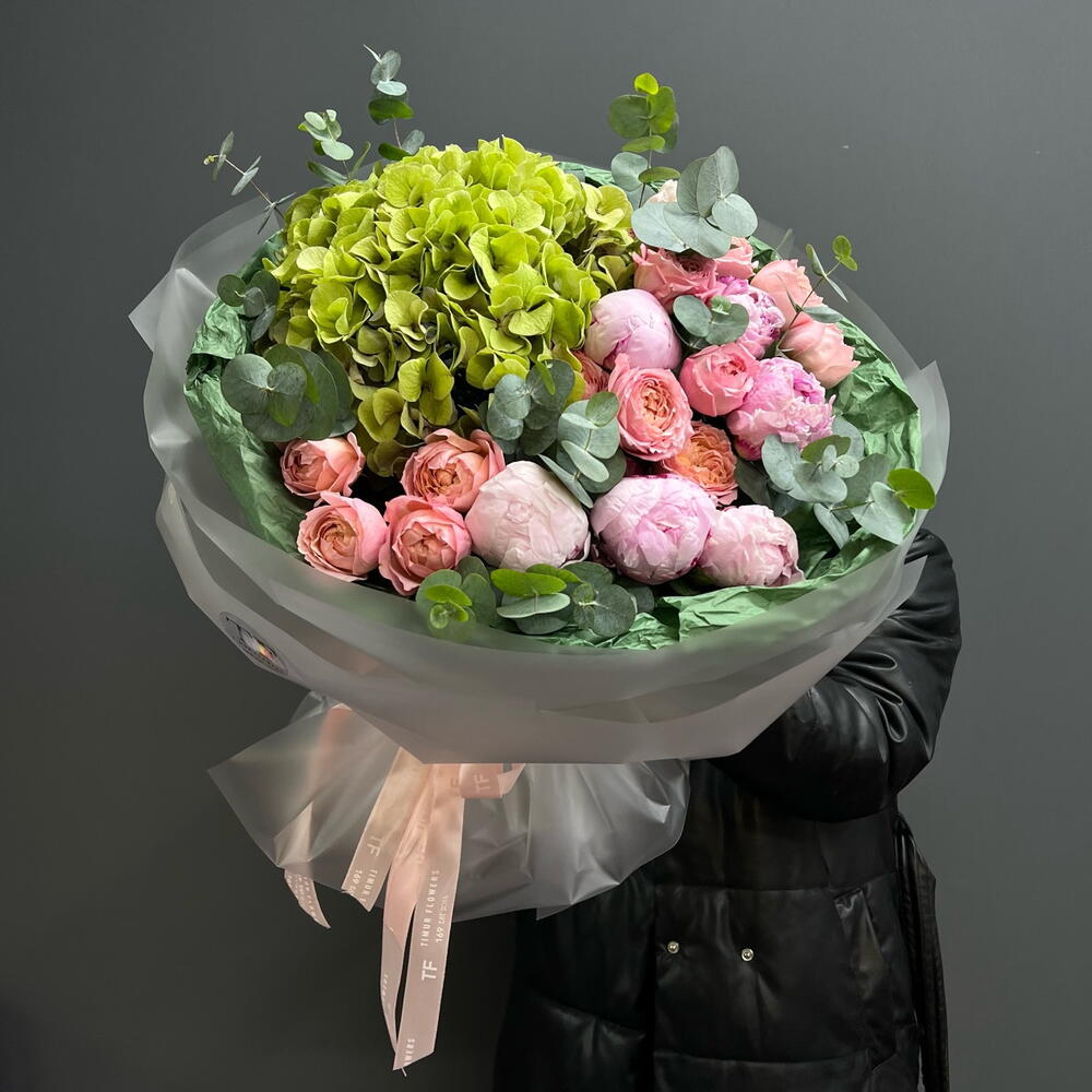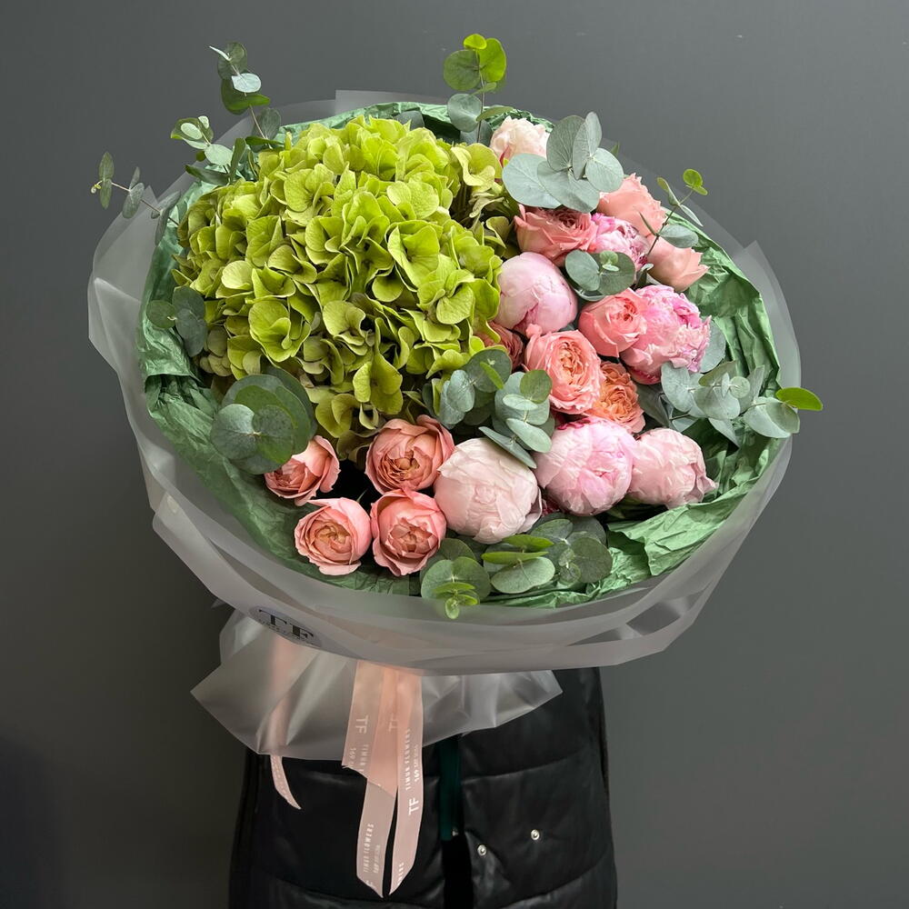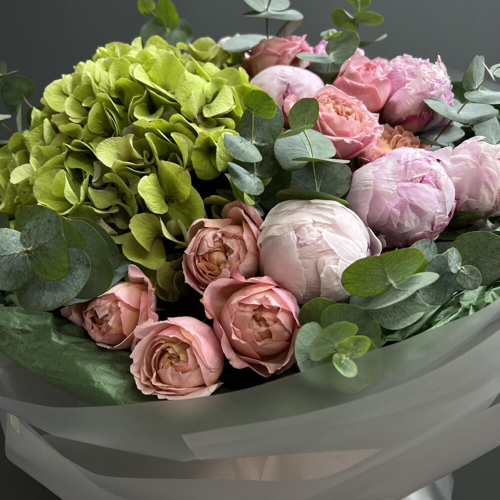 Композиция «Зелёный Вайб» Гортензия, Пионы, Пионовидная кустовая роза