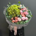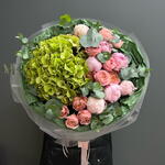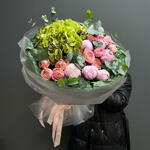 Букет в свежей зелёной палитре, собранный из гортензии, пионовидной кустовой розы Джульетта и нежных пионов. Объёмный, воздушный и трендовый — сочетает мягкую текстуру пионов с насыщенностью гортензии и изысканным шармом роз. Идеальный вариант, когда хочется подарить что-то по-настоящему утончённое и современное.