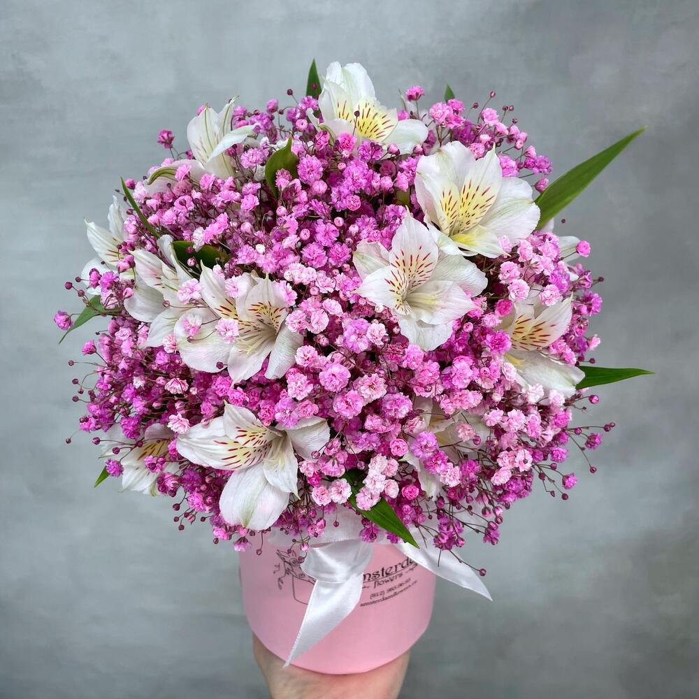 Альстромерия - 5 шт. Коробка шляпная - 1 шт. Оазис флористический - 1 шт. Гипсофила розовая - 5 шт.