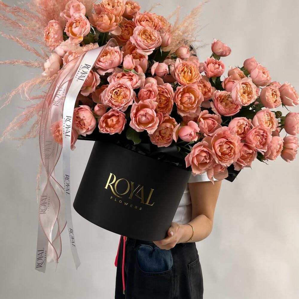 Элегантная композиция из пионовидных роз в стильной коробке. Нежные оттенки роз сочетаются с воздушными сухоцветами, создавая утонченный и роскошный образ. Идеальный подарок для особого случая или стильное украшение интерьера.
