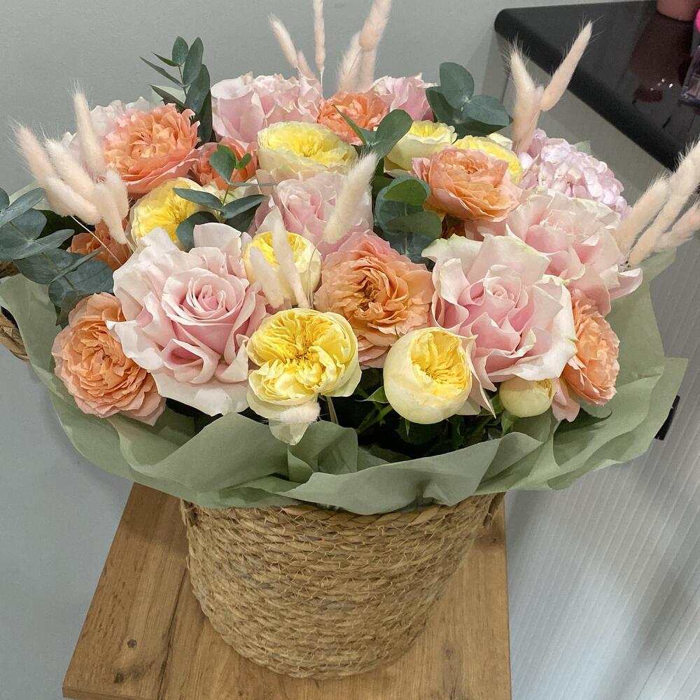 Гортензия - 1 шт. Роза кустовая - 9 шт. Эвкалипт - 2 шт. Роза - 7 шт.
