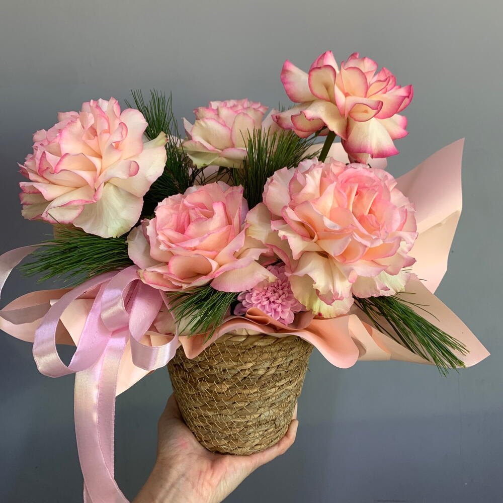 Хризантема кустовая - 1 шт. Роза - 5 шт. Пинус - 1 шт.