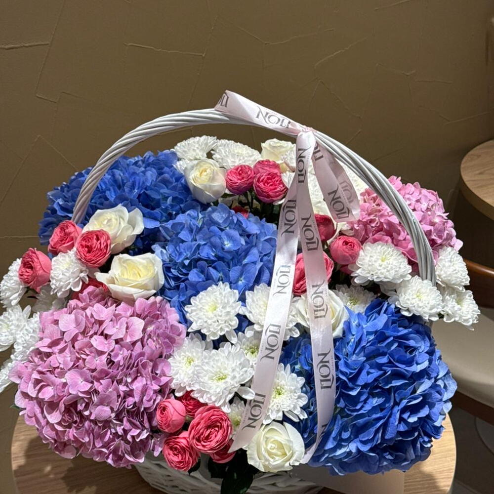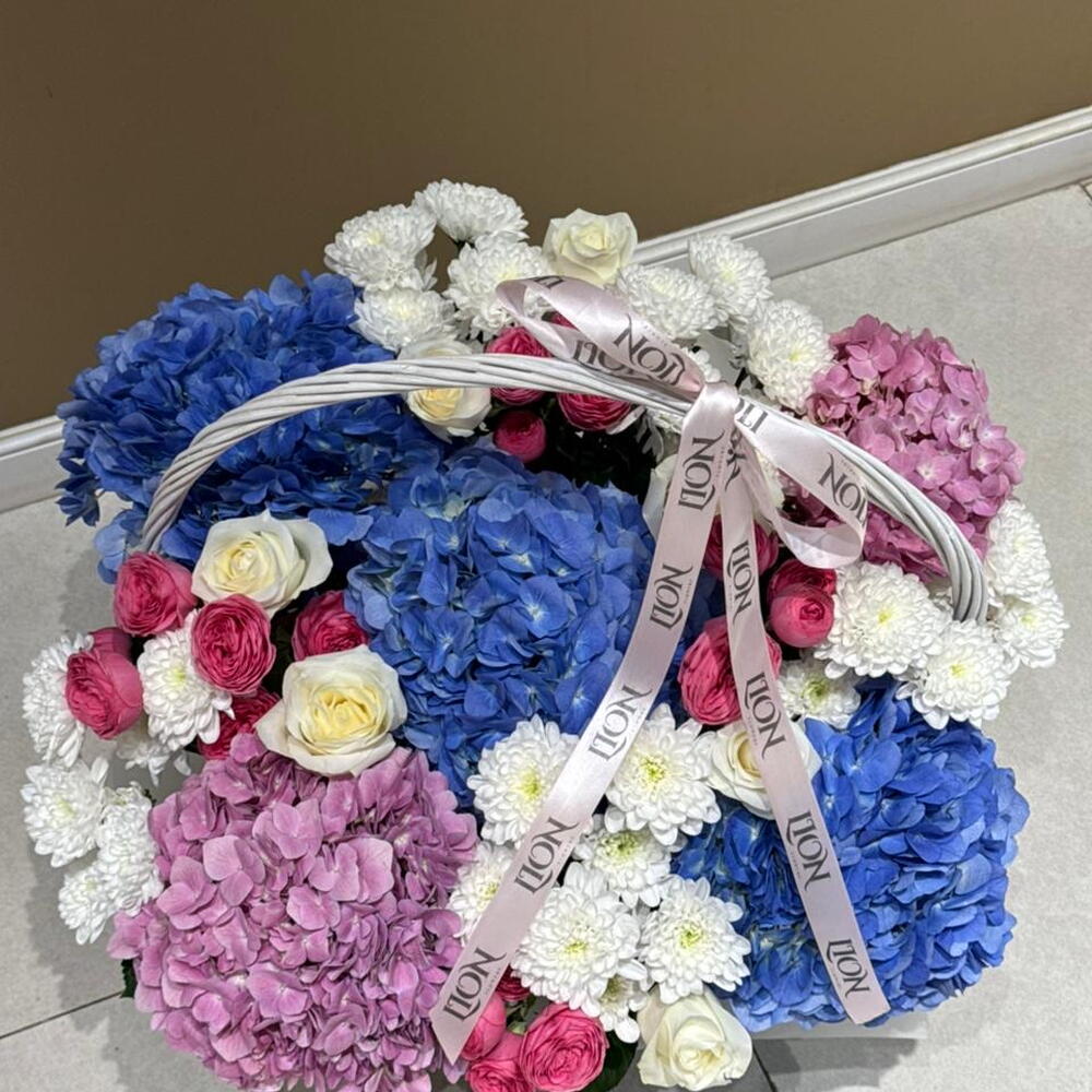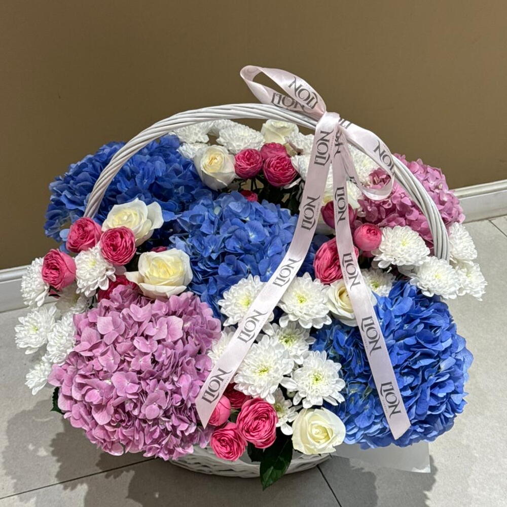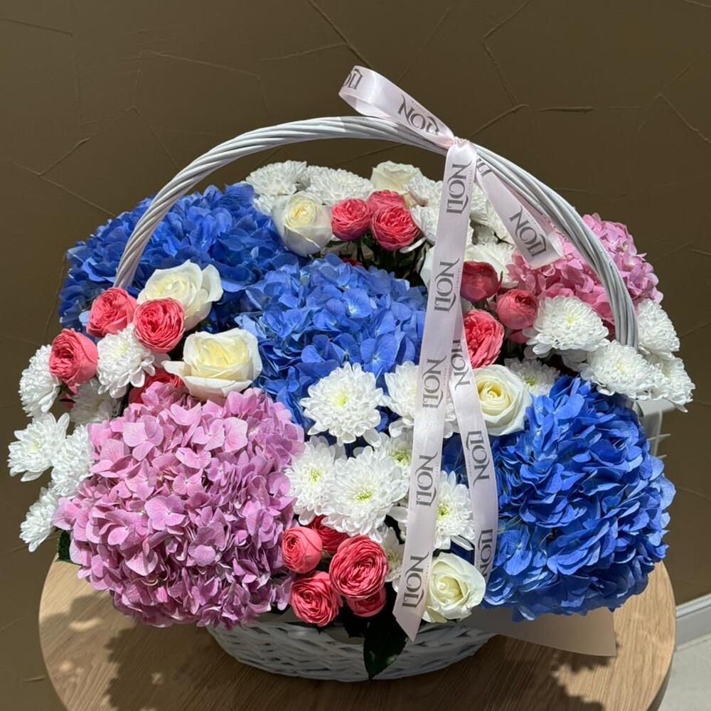 Гортензия - 5 шт. Корзина - 1 шт. Хризантема кустовая - 5 шт. Роза - 9 шт. Кустовая роза - 5 шт.