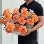 Роза Голландская - 19 шт. Упаковка дизайнерская - 2 шт. Оазис флористический - 2 шт. эвкалипт s - 2 шт. эвкалипт xl - 1 шт. корзина 5.9 - 1 шт.