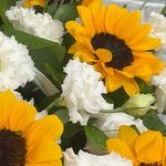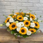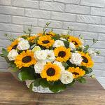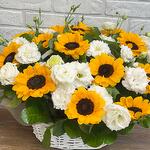 Корзина - 1 шт. Подсолнух - 13 шт. Оазис флористический - 2 шт. эустома белая - 10 шт. зелень салал листья - 5 шт.