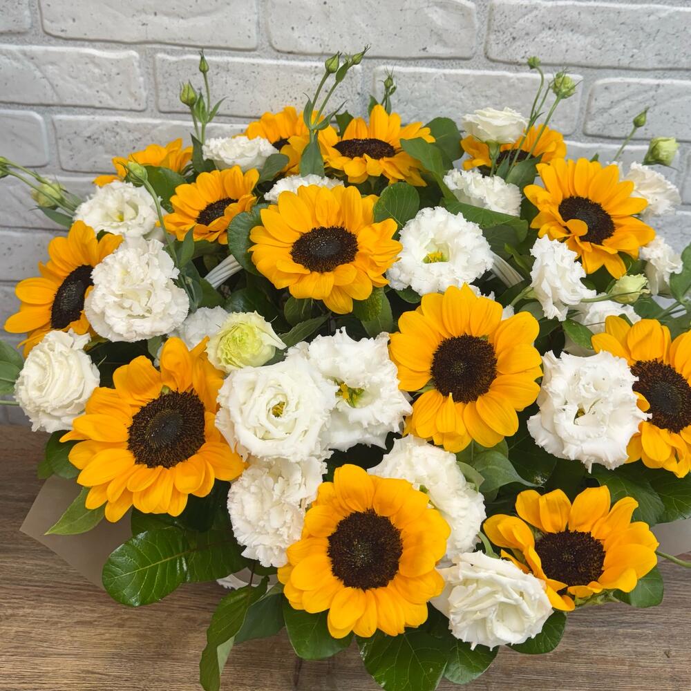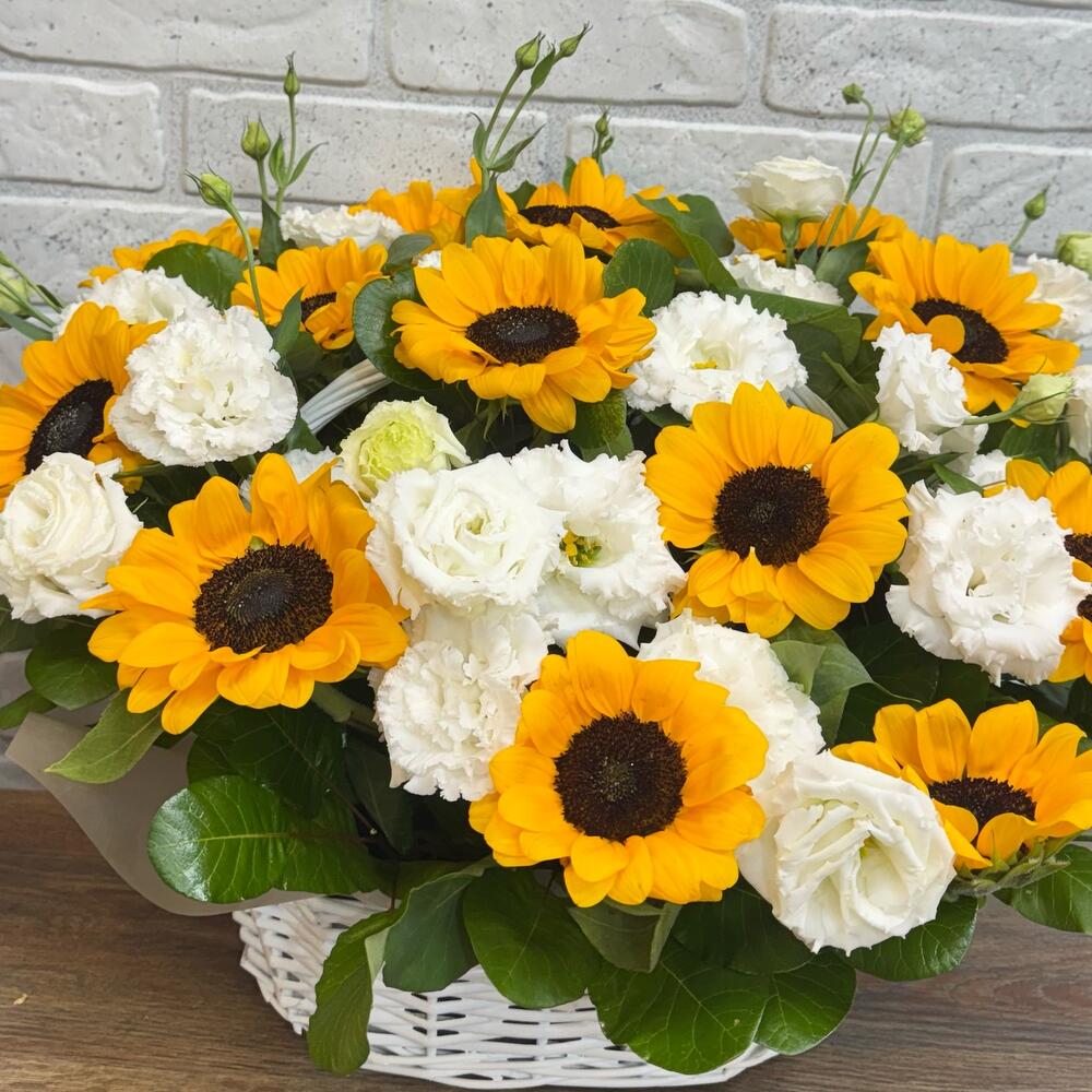Корзина - 1 шт. Подсолнух - 13 шт. Оазис флористический - 2 шт. эустома белая - 10 шт. зелень салал листья - 5 шт.