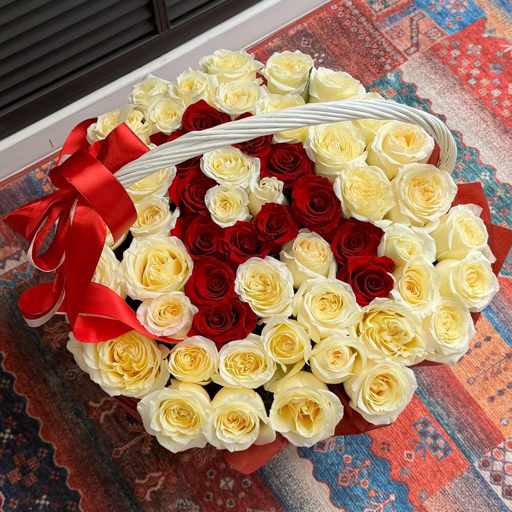 Роза - 51 шт. Корзина плетеная - 1 шт. Оазис флористический - 2 шт.