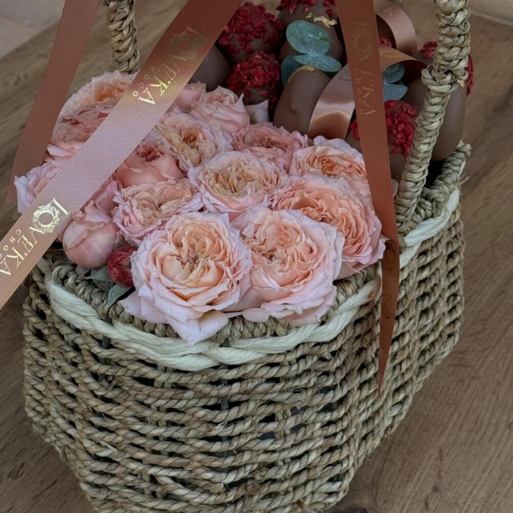 Корзина плетеная - 1 шт. Клубника в шоколаде - 10 шт. спрей роза джульетта - 7 шт.