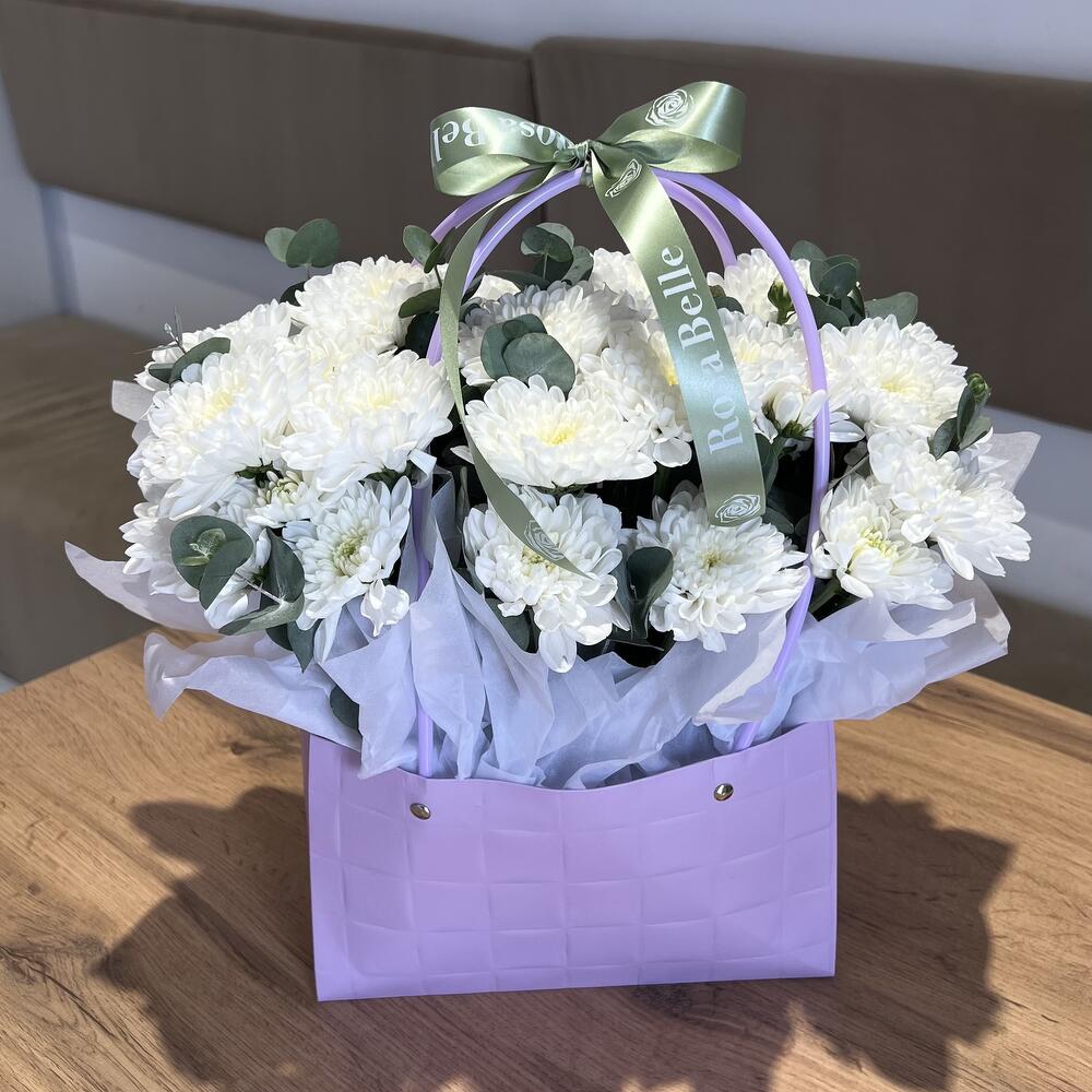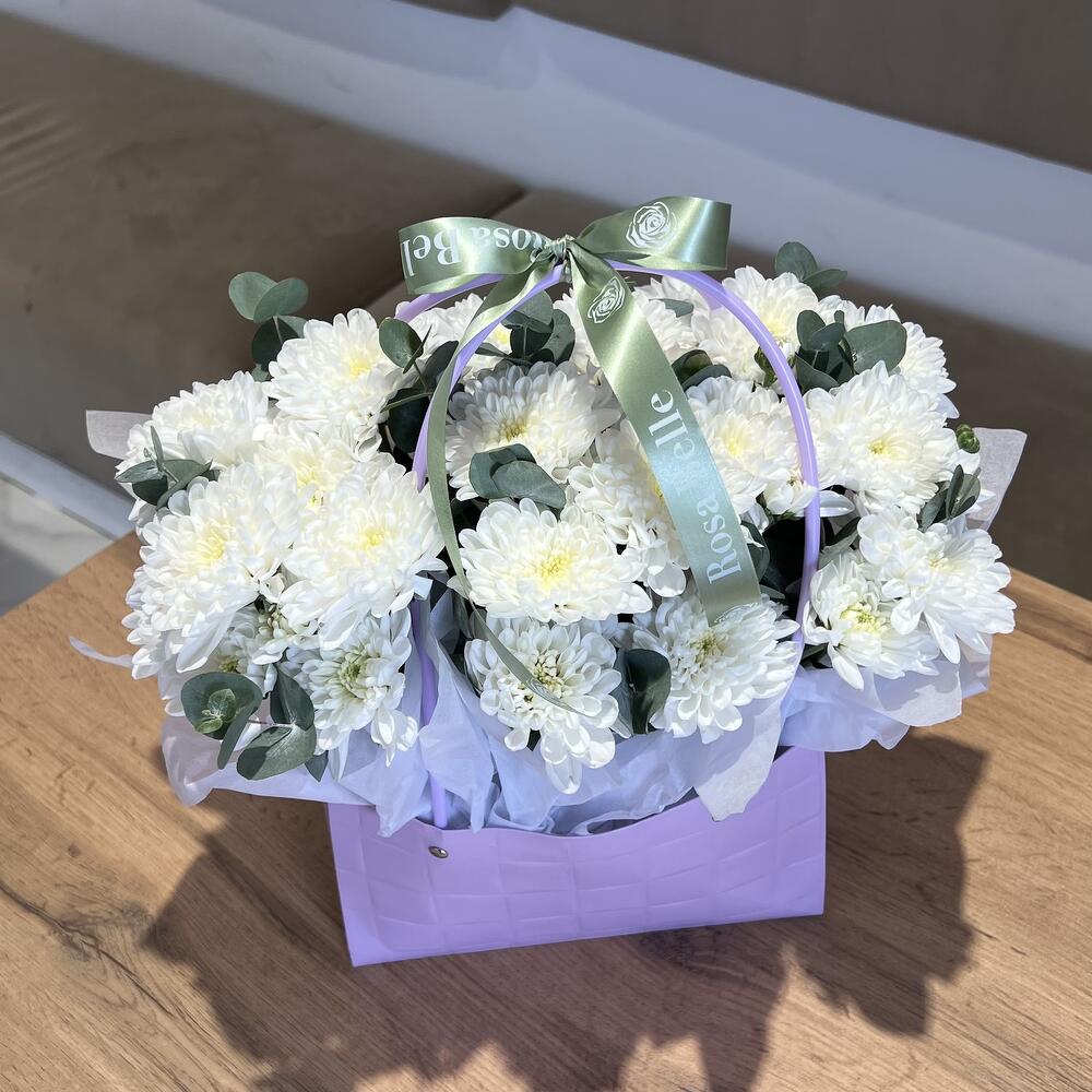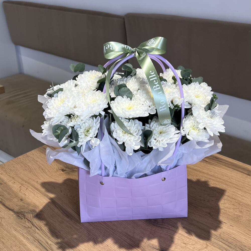 Сумочка комплимент из воздушной хризантемы с эвкалиптом, милый подарок из самых стойких цветов, будет радовать получателя очень долго Собираем только в день заказа, свежие цветы каждый день