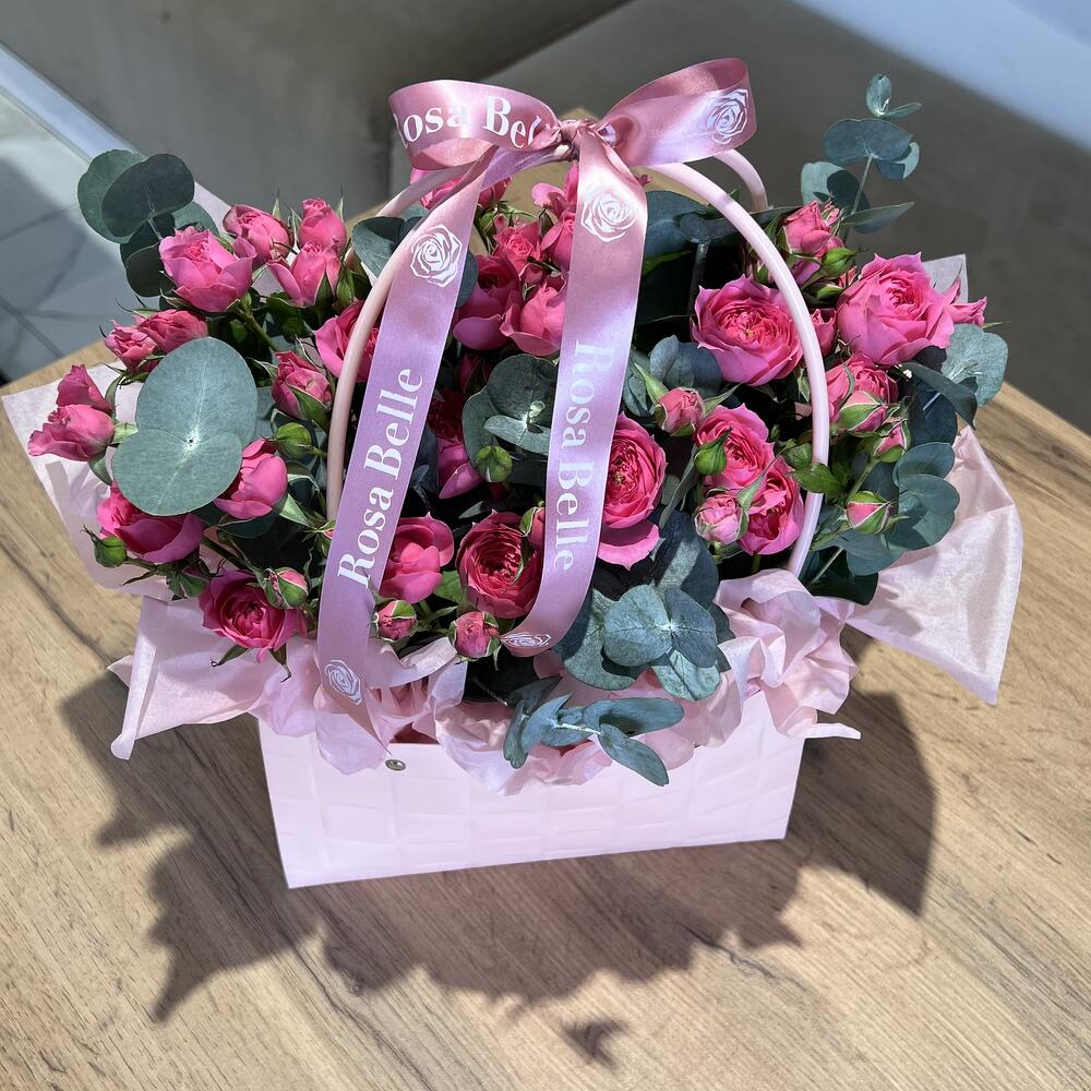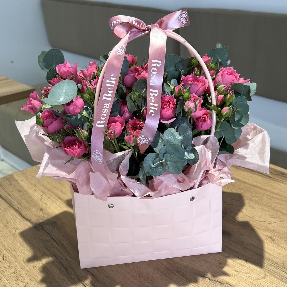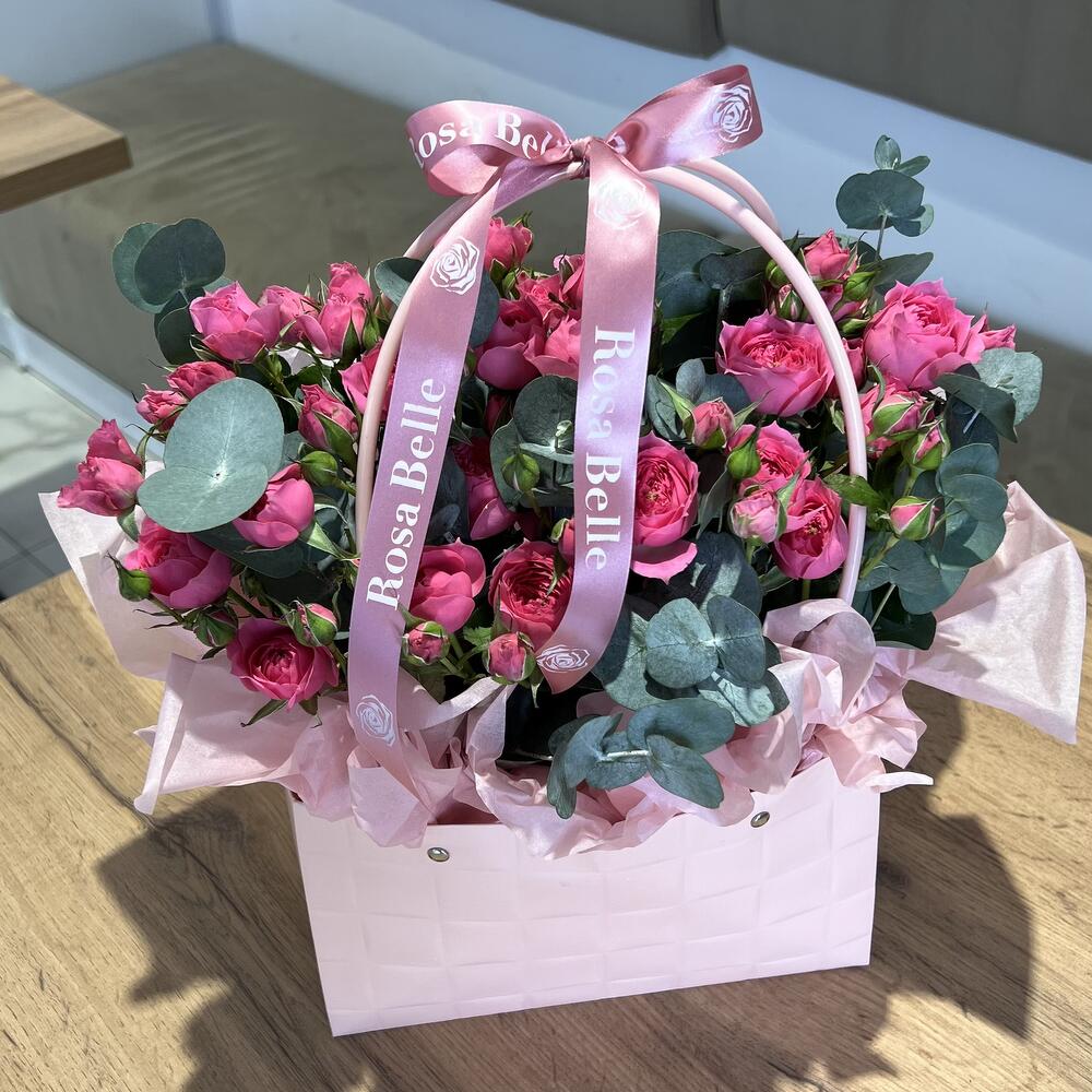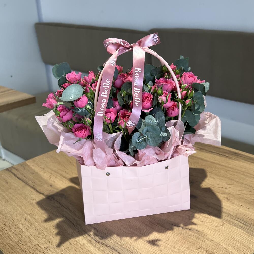 Сумочка комплимент, кустовые розы с эвкалиптом собраны на оазисе Удобная композиция, стильная и стойкая Собираем в день заказа, только свежие цветы