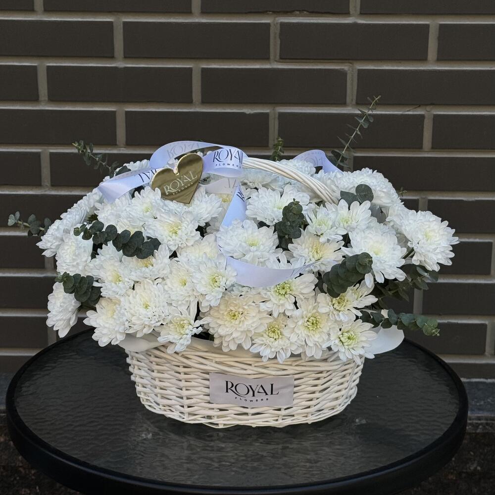 Лента - 1 шт. Хризантема кустовая - 13 шт. Эвкалипт - 1 шт. Оазис - 1 шт. корзина м (white) - 1 шт.