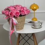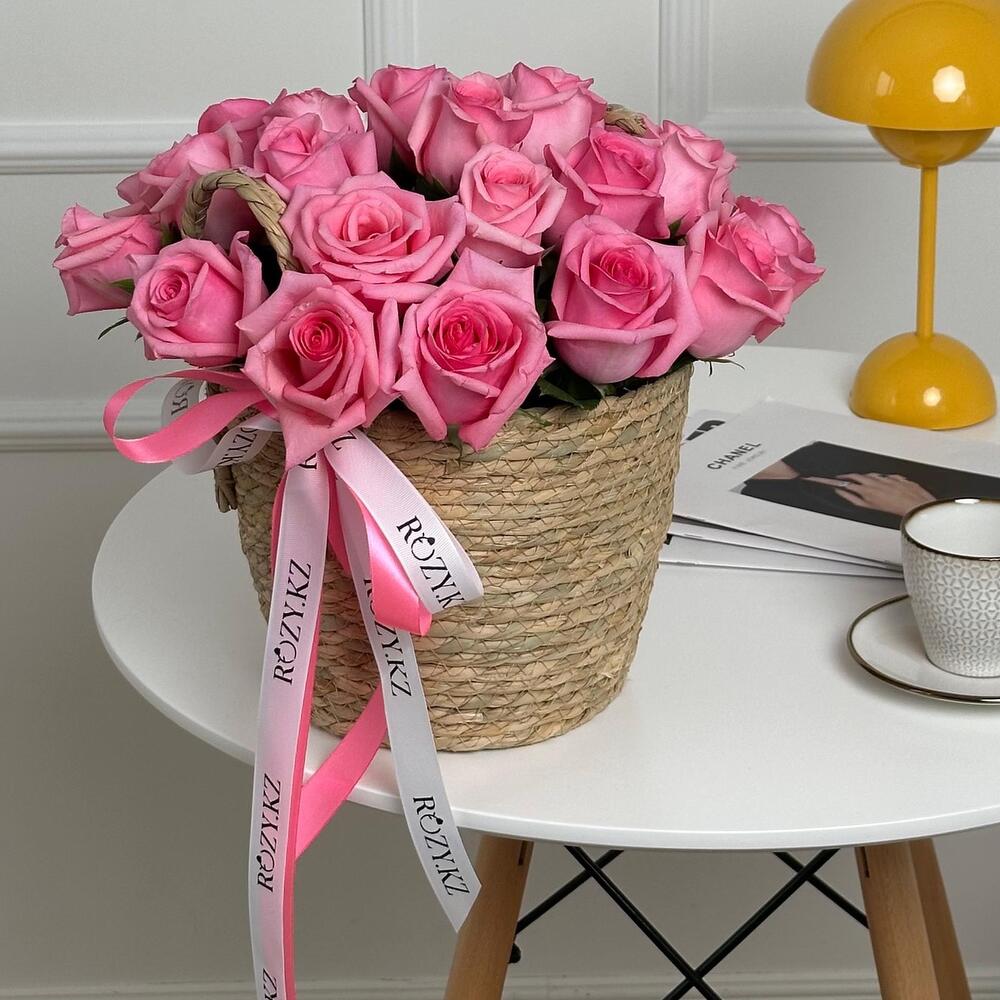 Роза Голландская - 25 шт. Упаковка дизайнерская - 1 шт. Оазис флористический - 2 шт. Корзина ротанговая - 1 шт.