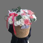 Очаровательная цветочная корзина с диантусами, хризантемами и эвкалиптом. Нежные оттенки розового и белого создают атмосферу тепла и уюта.