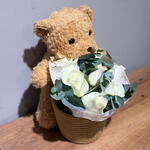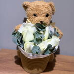 Эвкалипт - 2 шт. Роза - 7 шт. Корзина плетеная - 1 шт. Мишка плюшевый - 1 шт.