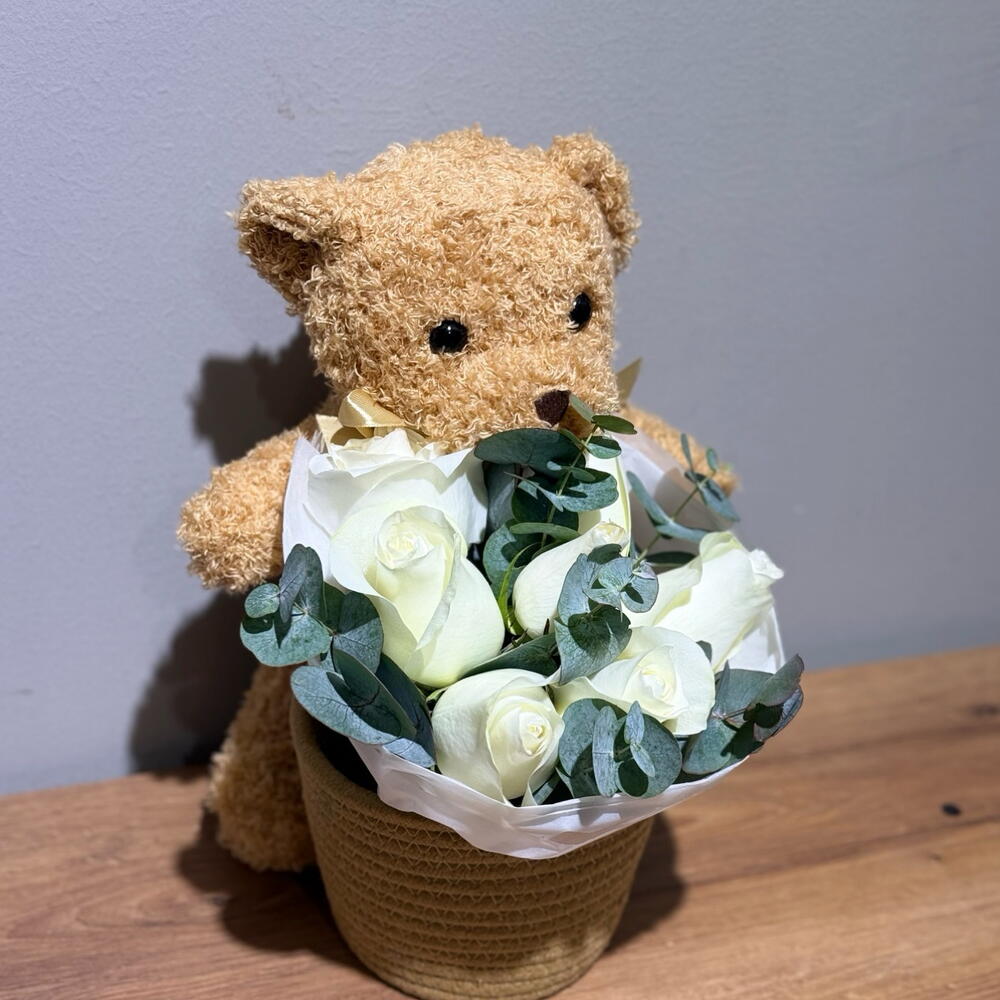 Эвкалипт - 2 шт. Роза - 7 шт. Корзина плетеная - 1 шт. Мишка плюшевый - 1 шт.