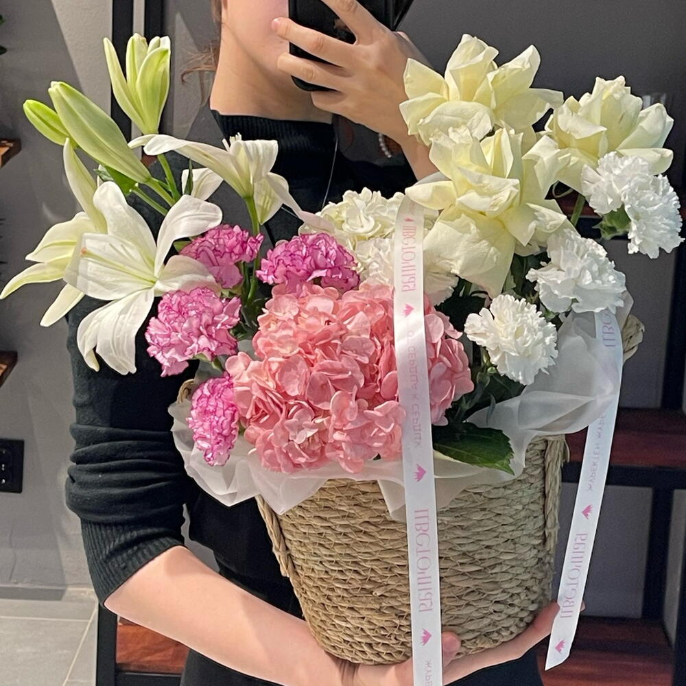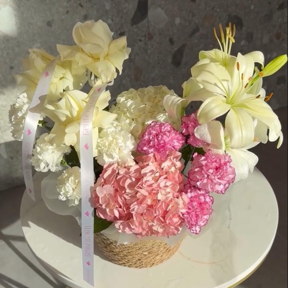 Гортензия - 2 шт. Лилия - 1 шт. Роза - 3 шт. Гвоздика - 8 шт.